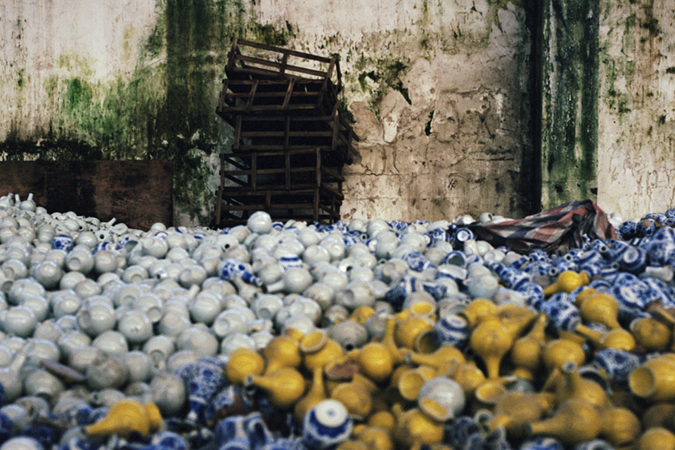 ...„Ob in schummrigen Hinterhöfen, schmuddeligen Garagen oder maroden Werkhallen: Auf engstem Raum stapeln sich hunderte und aberhunderte feinste Schüsseln und Vasen, Schalen und Skulpturen. Rutschige Böden, versehrte Fenster, eine schummrige Beleuchtung oder notdürftig geflickte Werkbänke würden im Westen keiner Überprüfung standhalten. Doch hier folgt jede Einzelheit einem Sinn, wie Pe-Lin Neven Du Mont sagt: „Die Arbeitsplätze zeigen, wie kreativ und individuell der jeweilige Handwerker sich in seiner Arbeitsstätte einrichtet, während diese für den Betrachter ein rätselhaftes Chaos darstellen.“