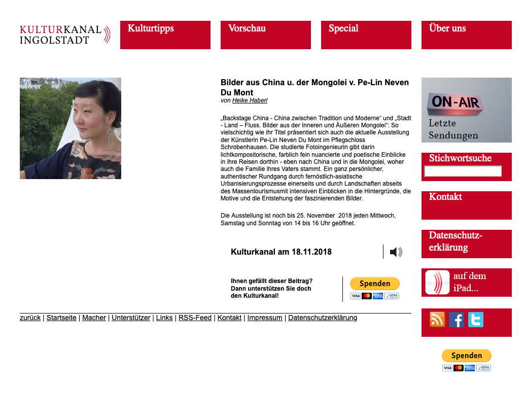Beitrag im kulturkanal-ingolstadt.de zur Ausstellung „Backstage China – China zwischen Tradition und Moderne“ und „Stadt – Land – Fluss. Bilder aus der Inneren und Äußeren Mongolei“ im Pflegschloss Schrobenhausen vom 28. Oktober bis 25. November 2018.